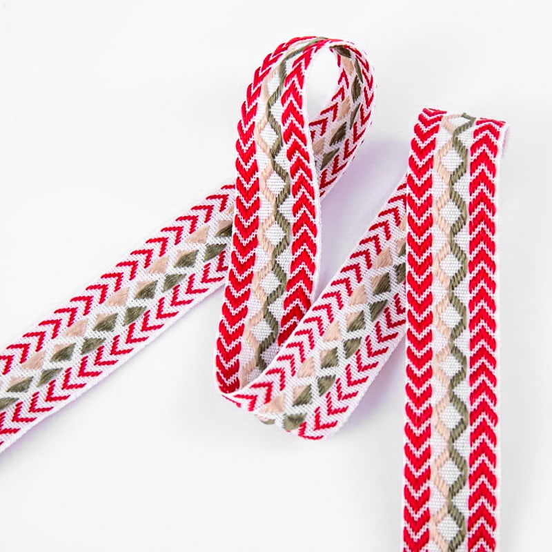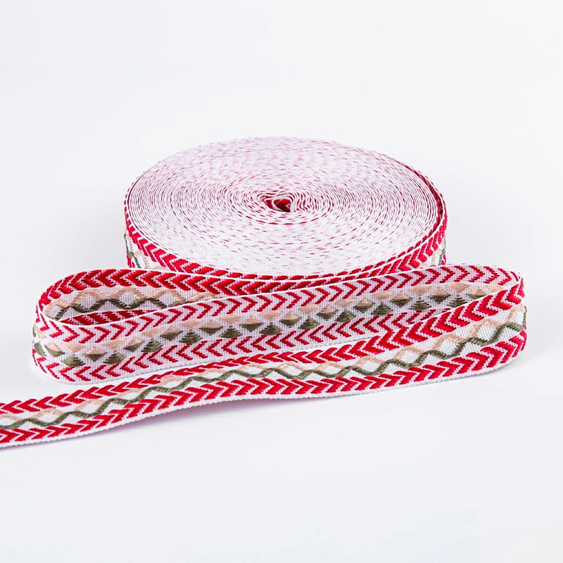 Tento 2,5 cm široký, obojstranný, overlockový žakárový popruh má obojstranný žakárový vzor, ktorý predstavuje nádherné vzory na oboch stranách. Môže sa pochváliť výnimočnou vizuálnou krásou a remeselným spracovaním. Vyrobené z prémiovej sieťovanej priadze a v kombinácii s pokročilou žakárovou technológiou spája estetiku s funkčnosťou, vďaka čomu je vhodná pre luxusnú posteľnú bielizeň, domácu výzdobu a produkty na mieru.